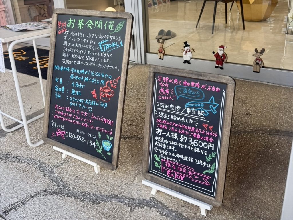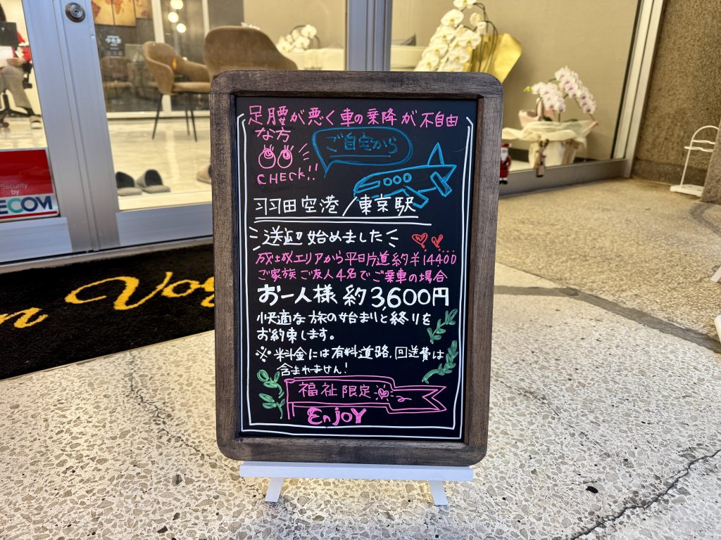 成城で送迎を始めました 2025-12-04 最終更新日時 : 2025-12-06 tomy 成城店をオープンして早1ヶ月 毎日店頭のチラシを手に取っていただく方が増え 店頭で足を止めていただいたら社員がお声をかけさせていただいてます お申込みに繋がるよう なにか起爆剤がないかと考える日々 お茶会案内に続き「羽田空港/東京駅の送迎始めました」の看板作りました(^O^)/ シニア旅行 高齢者旅行 介護旅行 介護付き旅行 介護タクシー 福祉タクシー Follow me!