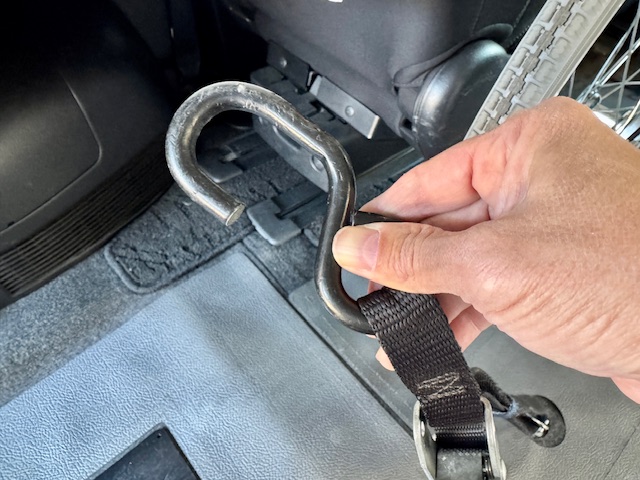 片手で車いすのブレーキ、片手で固定具を装着する際